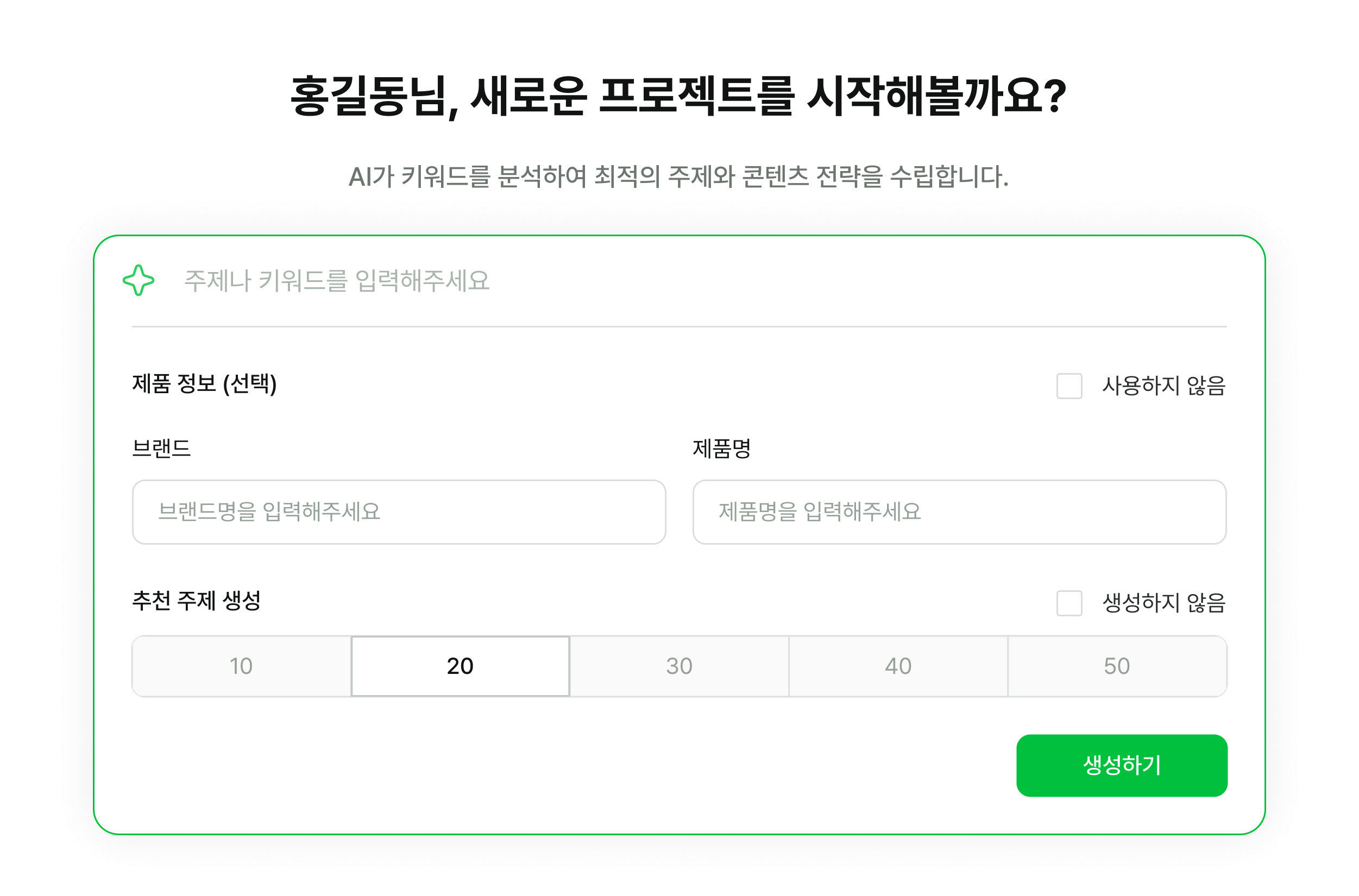 브랜드 전략 수립부터 주제 설계, 블로그 생성, SNS 발행, 성과 분석까지.흩어진 과정을 하나의 워크플로우로 연결해요.