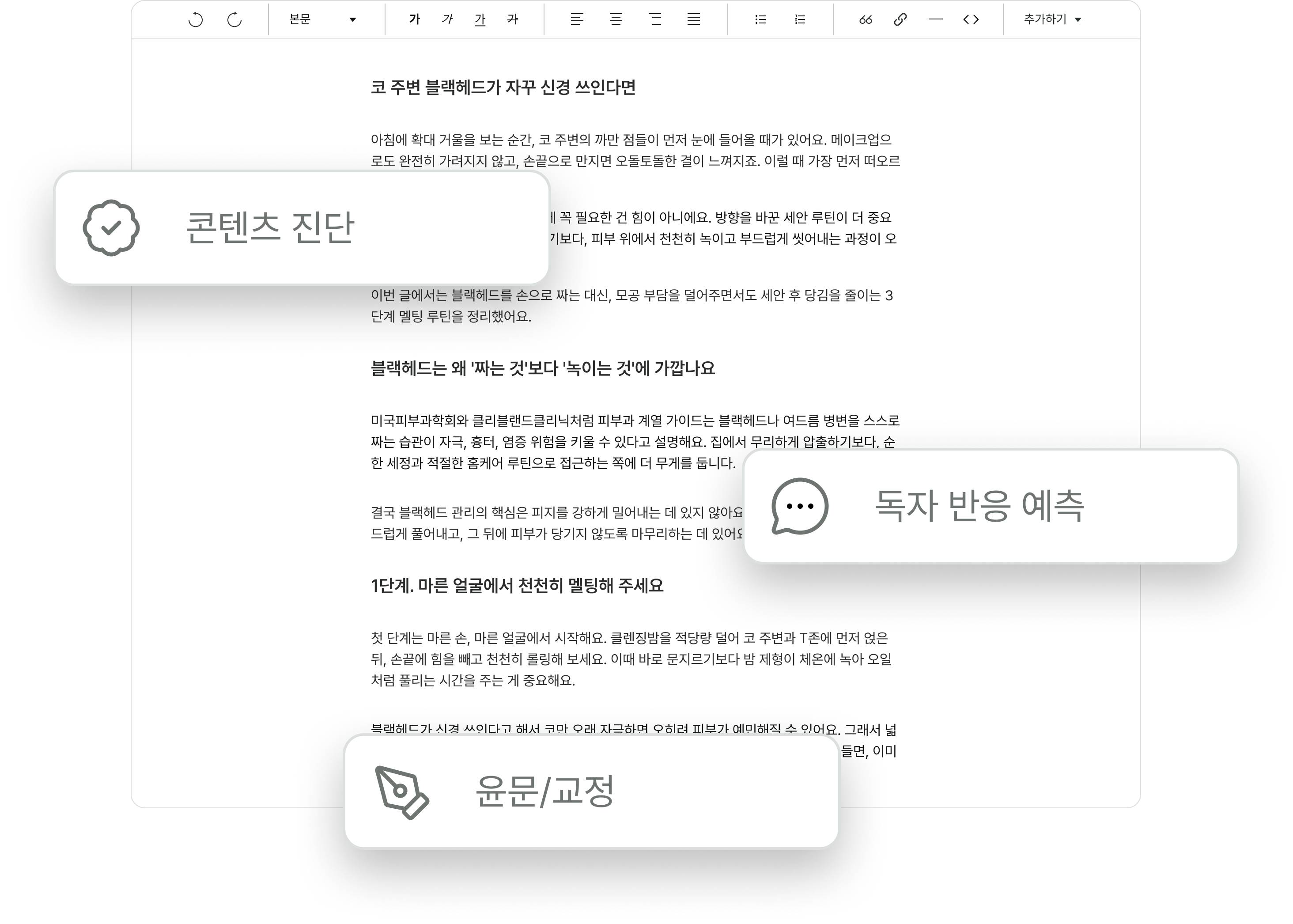 초안은 시작일 뿐이에요. 반응형 수정으로 글의 방향을 조정하고, 탈고 모드로 완성도를 높이고, AI 이미지 생성으로 비주얼까지 한 화면에서 완성해요.콘텐츠의 질은 글만으로 완성되지 않아요. 편집 안에서 완성돼요.