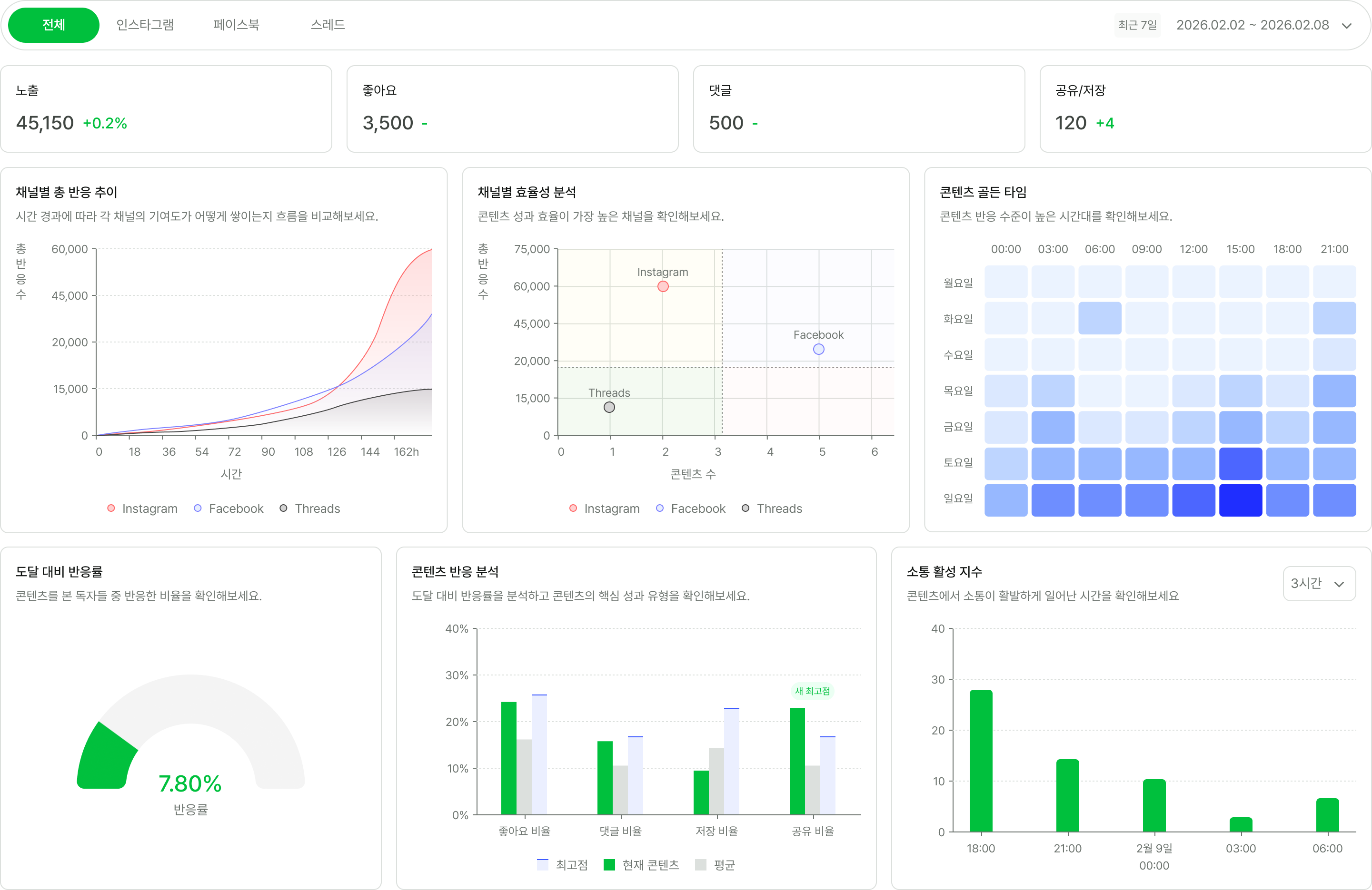 주제 하나로 채널마다 다른 언어로 살아나요. 채널 전용 포맷으로 재가공되어 자동 발행되고, 무엇이 통했는지 데이터로 확인해 다음 전략에 반영해요.발행은 끝이 아니라, 다음 전략의 시작이에요.